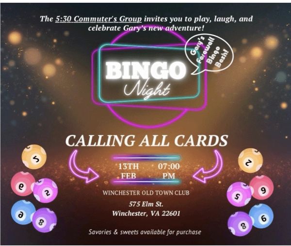 Come join the 5:30 commuter group in celbrating Gary's farewill with a Bingo Bash!